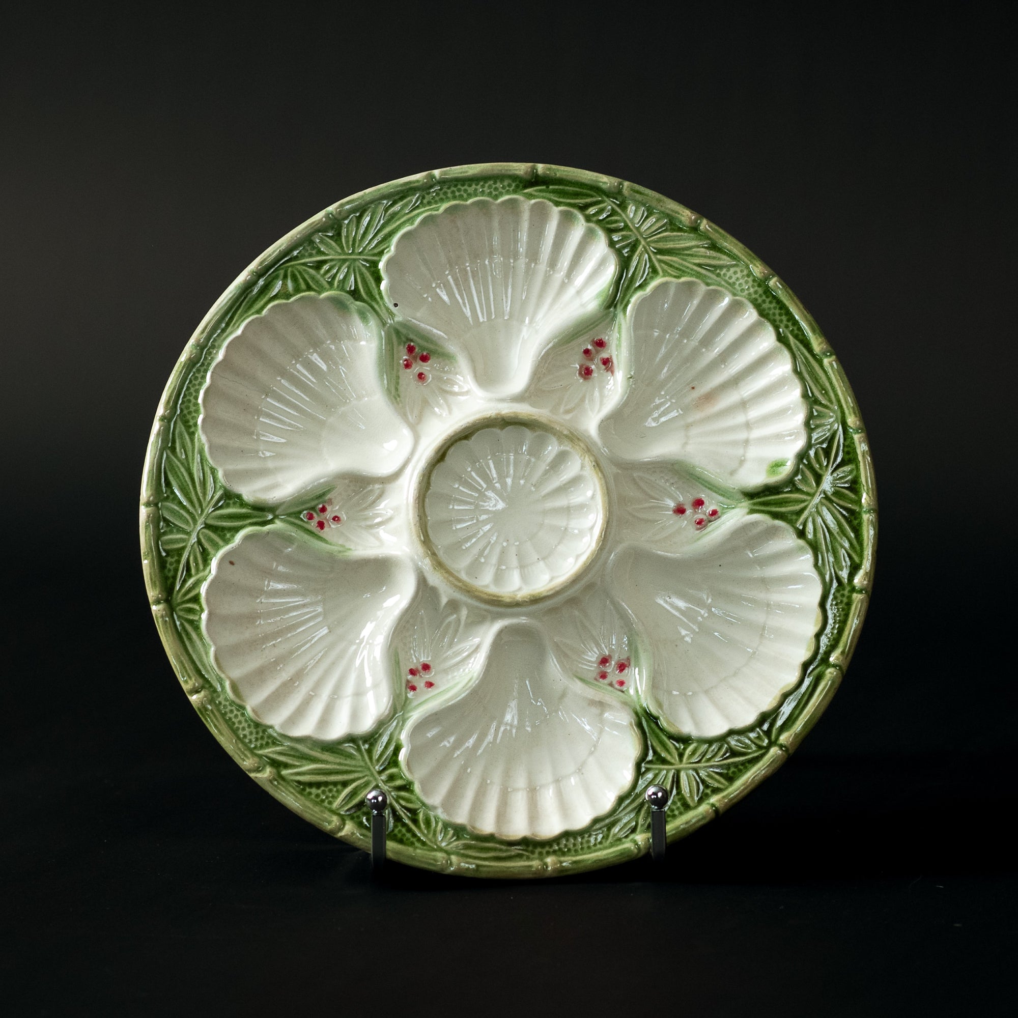 The Details: Vintage Bamboo Berries Majolica Oyster Plate - French - Salins 1890