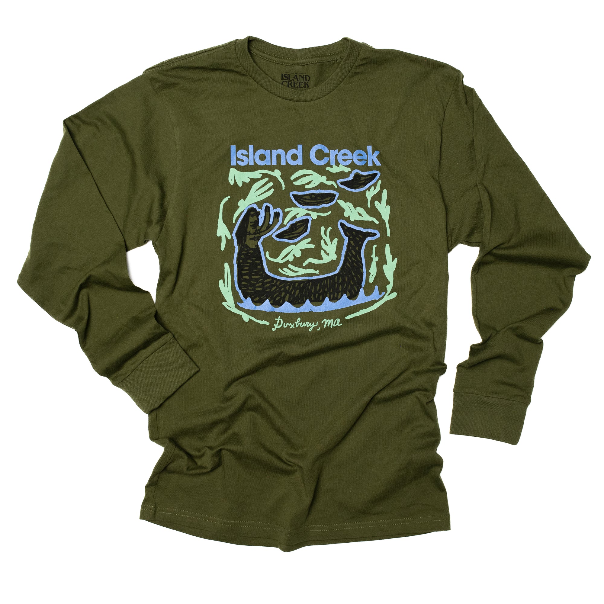 The Details: Color - Olive. Standard fit long sleeve T-shirt. Large graphic on front center. 100% cotton. May shrink after washing.
